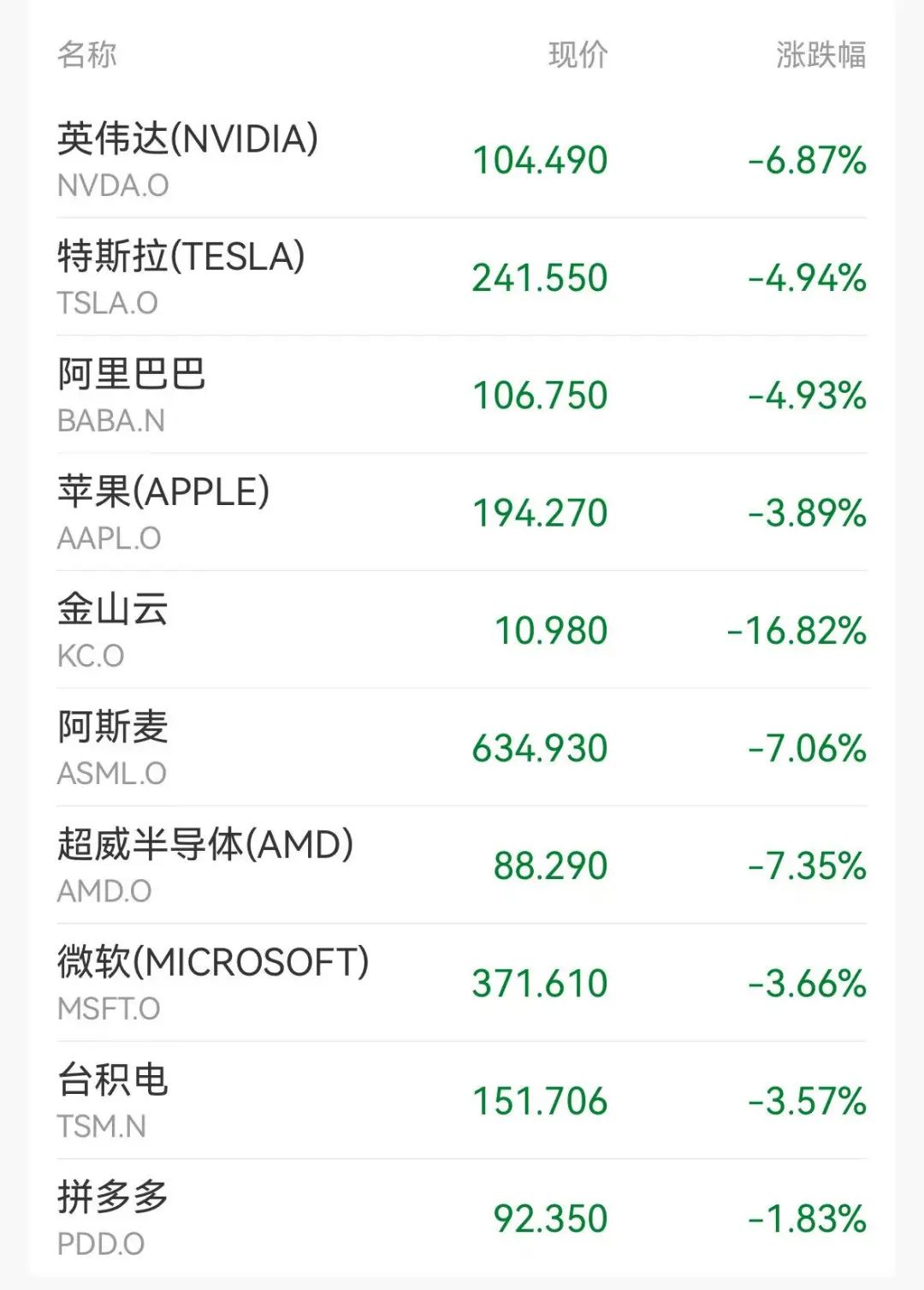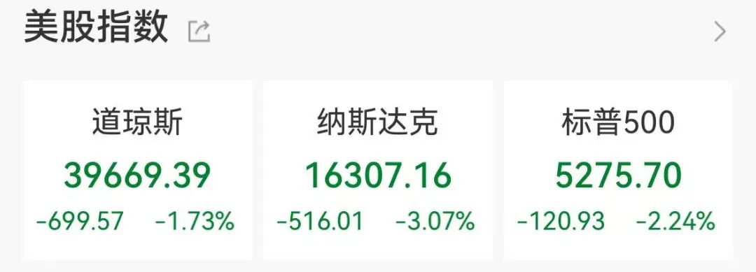 昨日晚间,美股三大股指集体低开低走,道指跌1.73%;纳指盘中最大跌幅4.5%,收盘跌3.07%;标普500跌2.24%。