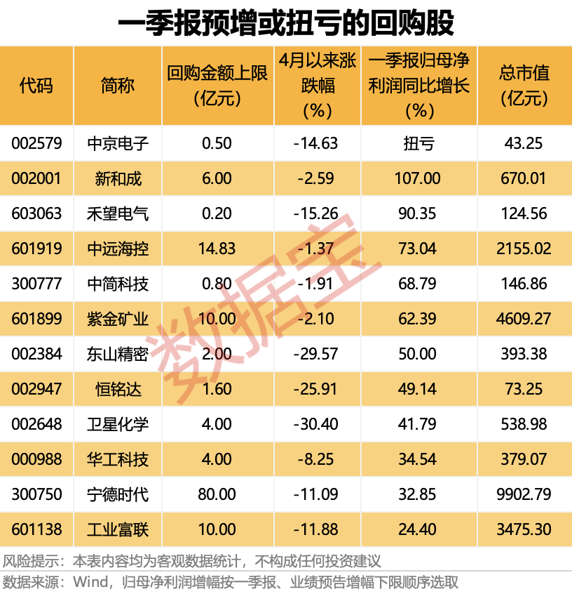 从业绩上来看,发布回购预案的个股中,15股发布了一季度业绩预告或一季报。按一季报归母净利润同比增幅、预告归母净利润同比增长下限顺序计算,12股净利润预增或扭亏,报喜比例达到八成。